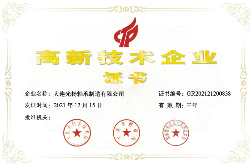 • 大連光揚軸承制造有限公司順利通過“高新技術企業”復審認定,并收到了大連市科學技術局、大連市財政局、國家稅務總局大連市稅務局聯合頒發的《高新技術企業證書》。 高新技術企業是國家為鼓勵高新技術企業發展,調整產業結構和提升國家經濟競爭力而設立的專項資質認定,具有極高的含金量。 此次通過高新技術企業復審認定,既是對光揚軸承近年來發展的認可,也是對公司科研創新能力和技術實力的充分肯定。